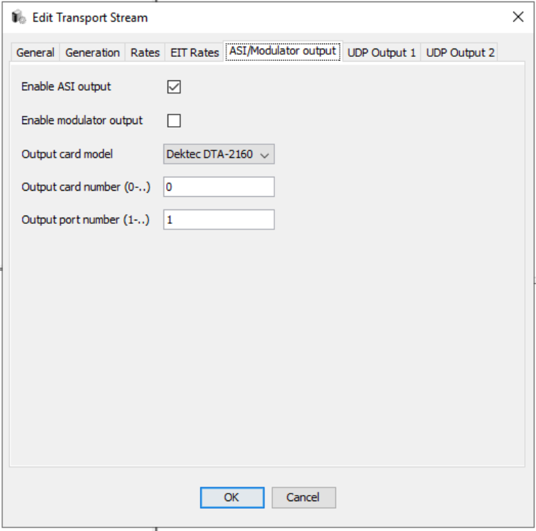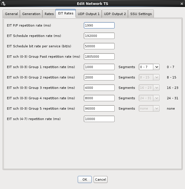 EIT P/F repetition rate :Repetition rate for Event Information Table Present/Following EIT Schedule repetition rate : Repetition rate for Event Information Table Schedule EIT Schedule bit rate per service : Maximum output bit rate of service for Event Information Table Schedule EIT sch (0-3) Group Past repetition rate : When Generate EIT Schedule 0-3 is enabled, this is the repetition rate for past Event Information Table Schedule events EIT sch (0-3) Group 1 repetition rate : When Generate EIT Schedule 0-3 is enabled, this is the repetition rate for the first partition of the Event Information Table Schedule, EIT sch (0-3) Group 2 repetition rate : When Generate EIT Schedule 0-3 is enabled, this is the repetition rate for the second partition of the Event Information Table Schedule, EIT sch (0-3) Group 3 repetition rate : When Generate EIT Schedule 0-3 is enabled, this is the repetition rate for the 3rd partition of the Event Information Table Schedule, EIT sch (0-3) Group 4 repetition rate : When Generate EIT Schedule 0-3 is enabled, this is the repetition rate for the 4th partition of the Event Information Table Schedule, EIT sch (0-3) Group 5 repetition rate : When Generate EIT Schedule 0-3 is enabled, this is the repetition rate for the 5th partition of the Event Information Table Schedule, EIT sch (4-7) repetition rate : When Generate EIT Schedule 4-7 is enabled, this is the repetition rate for the partition holding days 4-7 of the Event Information Table Schedule, |