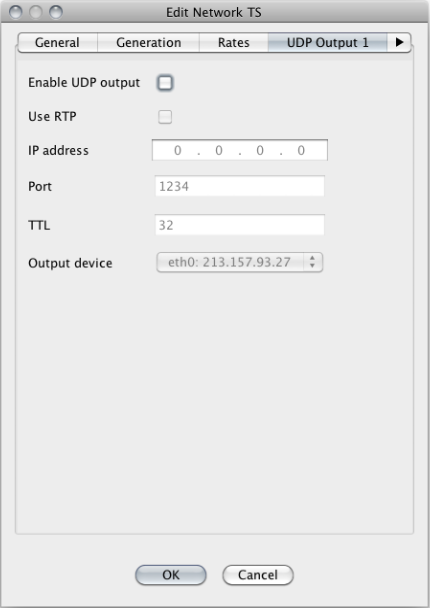 UDP output -tab defines the transport stream output for the selected Network. Each Network's transport stream can be outputted as IP multicast/unicast from two separate network cards to get as redundant output from a single server as possible. For redundancy purposes it is recommended that the multicast addresses of the outputs are different as well as the Output devices. The outputs should be then connected to either an IP switch that can monitor the output or to a multiplexer that can do the same. An example is given below. Enable UDP output: IP Address: Multicast address for the MPEG2 TS Port: IP port in which the multicast should be transmitted TTL: Time to Live for the IP packets Output device: Defines the physical network interface card that is used to output the MPEG2 TS for this Network |
