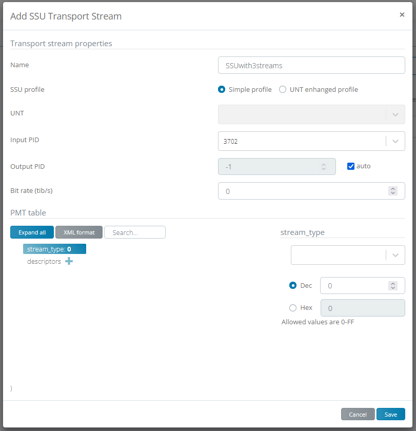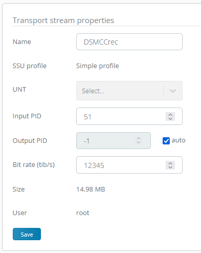 When a transport stream file is uploaded to new OTA SSU TS instance, it is parsed and all input PIDs from it are displayed to choose from.