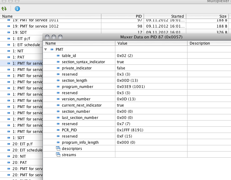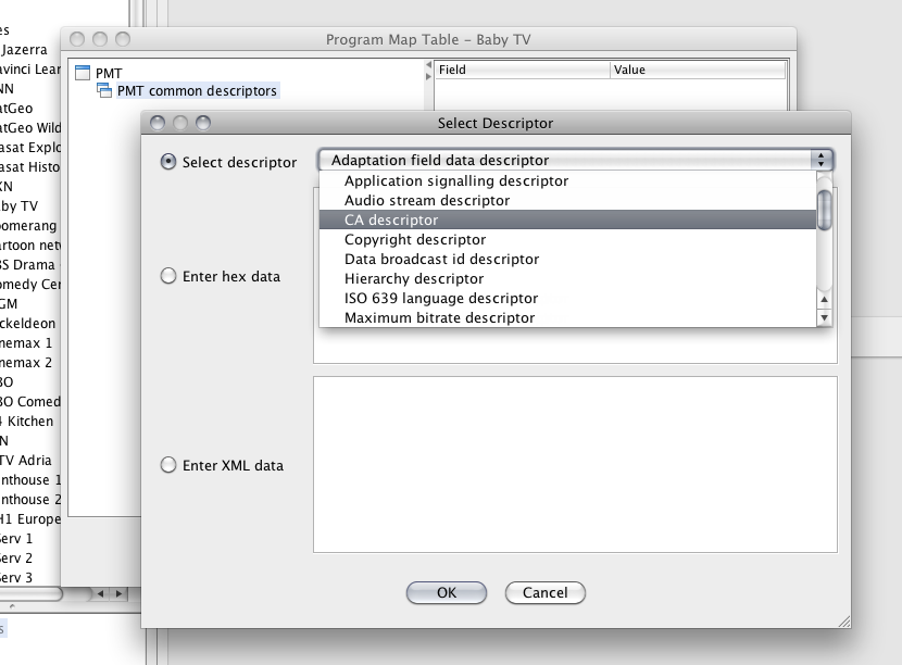 Selecting the desired DVB Service opens a pop-up that gives access to the available descriptors for the table.