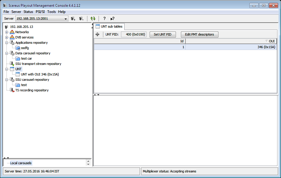 SSU server can generate multiple UNT sub tables that each have a unique OUI (i.e. two sub tables can't use the same OUI value). Currently all UNT sub tables are sent on a single PID. To edit UNT PID, select UNT from server tree and click on the Set UNT PID button in the tool bar.