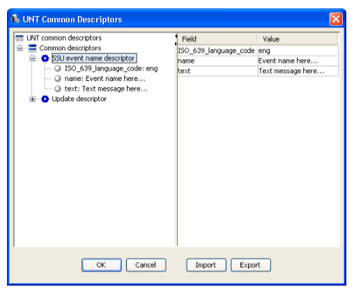 Each UNT sub table has a list of descriptors that will be inserted to the common descriptor loop of the sub table. To edit this descriptor list, first select UNT from server tree. Then right click on a sub table in the list under the UNT sub tables tab and select Edit Common Descriptor. A dialogue that allows you to modify the descriptor list is presented.