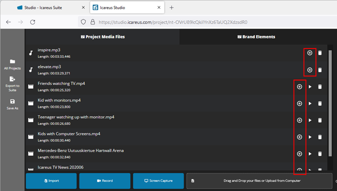 To create a project an user can bring different kind of media files to Icareus Studio, which can be then added to video.