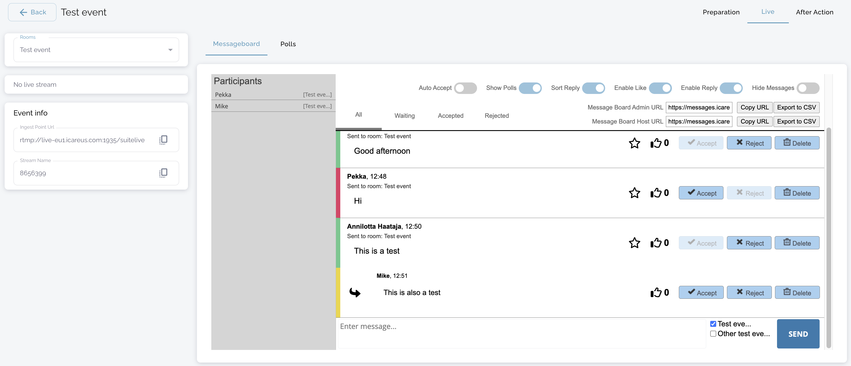 Moderator/Admin can also copy and/or open this Message Board admin UI on a second browser or on a different device and that way give access for e.g. a third party moderator to take care of the message board moderation. This way it's not necessary to give third parties access to Icareus Suite Video Cloud itself.