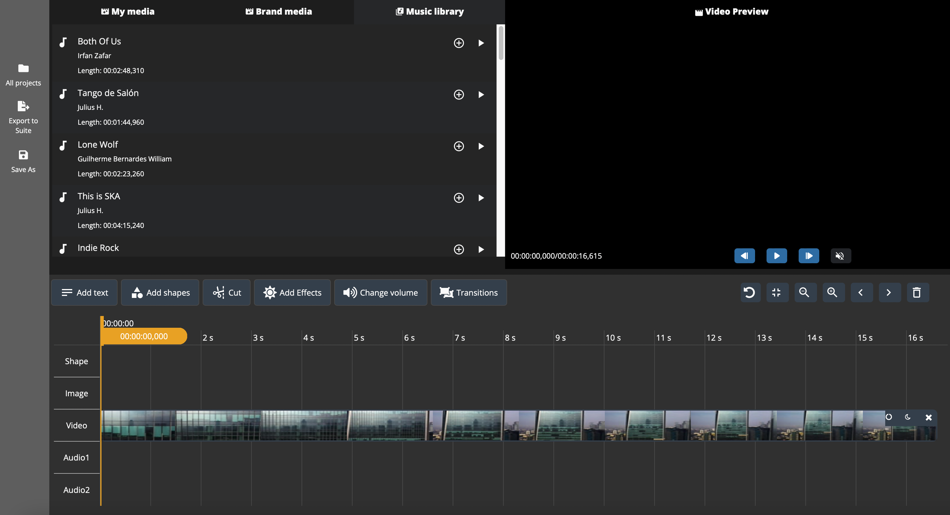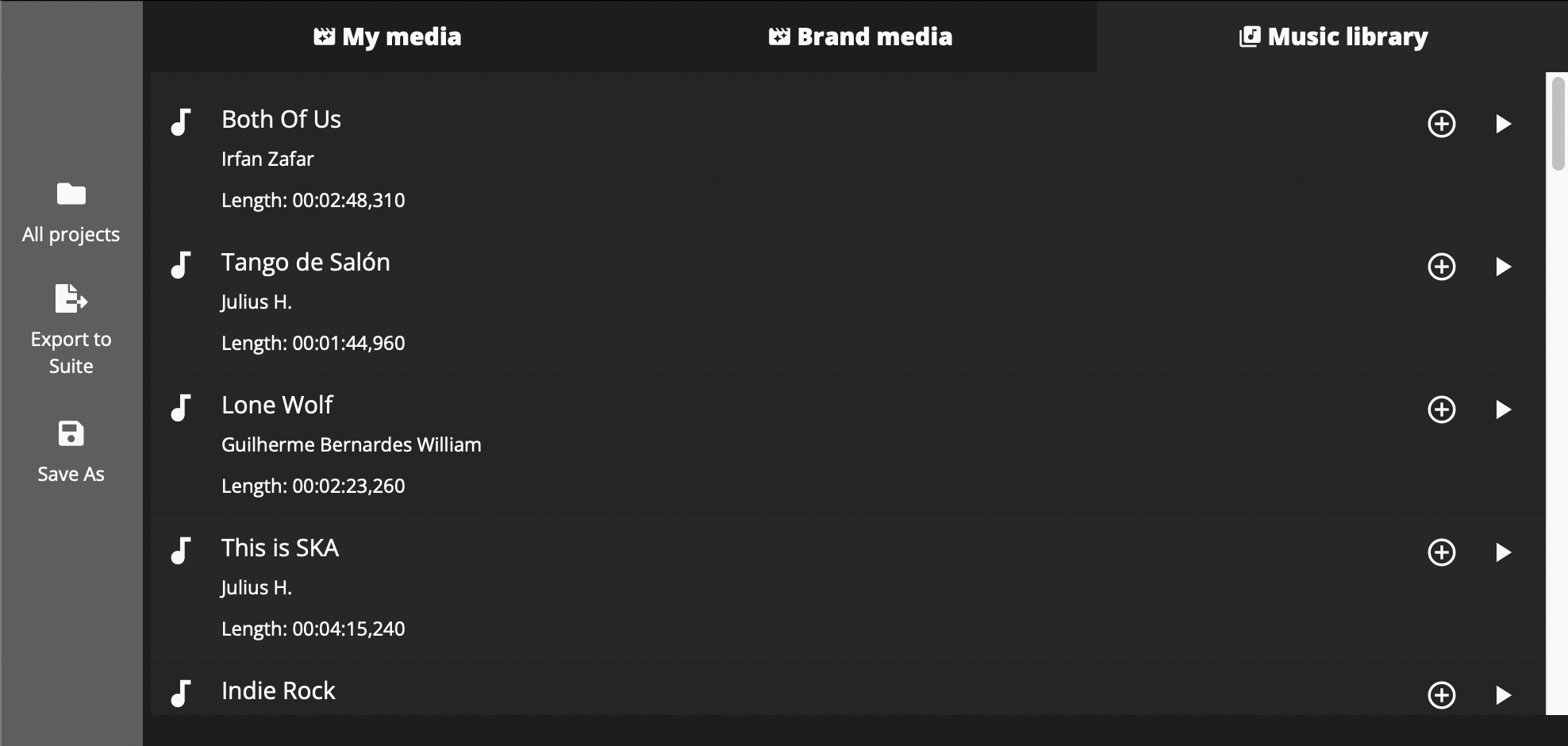 The user can add music to their video from the free music library. The library contains free music from various genres to use eg. as background music.