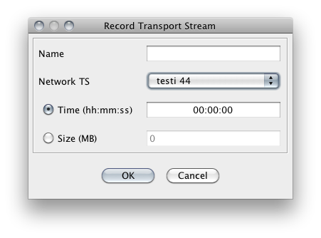 To record a transport stream file from Playout server’s transport stream output, select Tools -> Record Transport Stream or click on the record button under the Recording repository tab. It will open the pop-up window shown below: