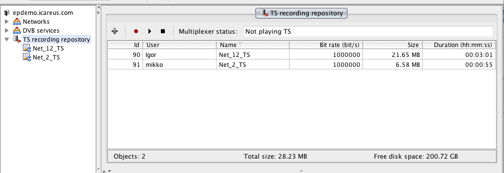 Icareus Playout server can be used as a TS player and recorder to help in debugging or to playout pre-recorded transport stream files. Transport stream files are shown in PMC in the Recording repository. Icareus Playout server can be used as a TS player, i.e. for playing pre-recorded transport stream files to server’s ASI or IP output. Files can be uploaded to the server or recorded from Playout server’s transport stream output (multiplexer).