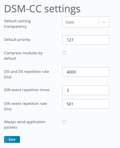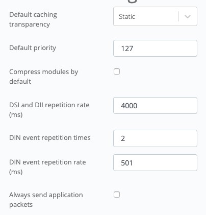 Default caching transparency Default caching transparency for object carousel modules, used when creating new carousels in PMC. Default priority Default priority for object carousel modules, used when creating new carousels in PMC. Compress modules by default If this setting is enabled, object carousel modules will be compressed by default when creating new carousels in PMC. DSI and DII repetition rate Repetition rate of Download Server Initiate and Download Info Indication in data and object carousels, measured in milliseconds. DIN event repetition times How many times to repeat "Do it now" stream events in carousels. DIN event repetition rate Repetition interval for "Do it now" stream events in MHP carousels, measured in milliseconds. |