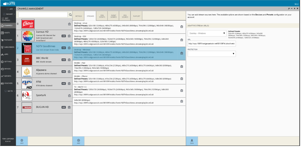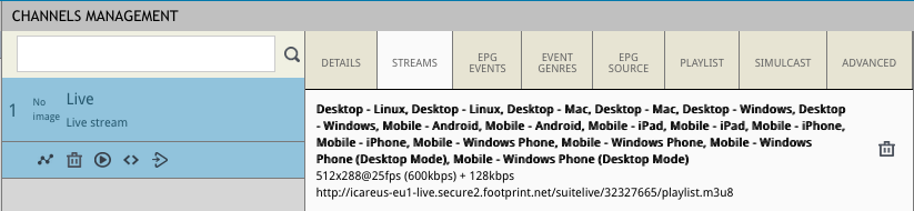 The stream tab is used to configure the optimal stream for each end-device to the single channel defined in the list. You might need a different stream version to support e.g. Desktop, iOS and Android phones. Each platform may use different stream format, quality, and resolution.