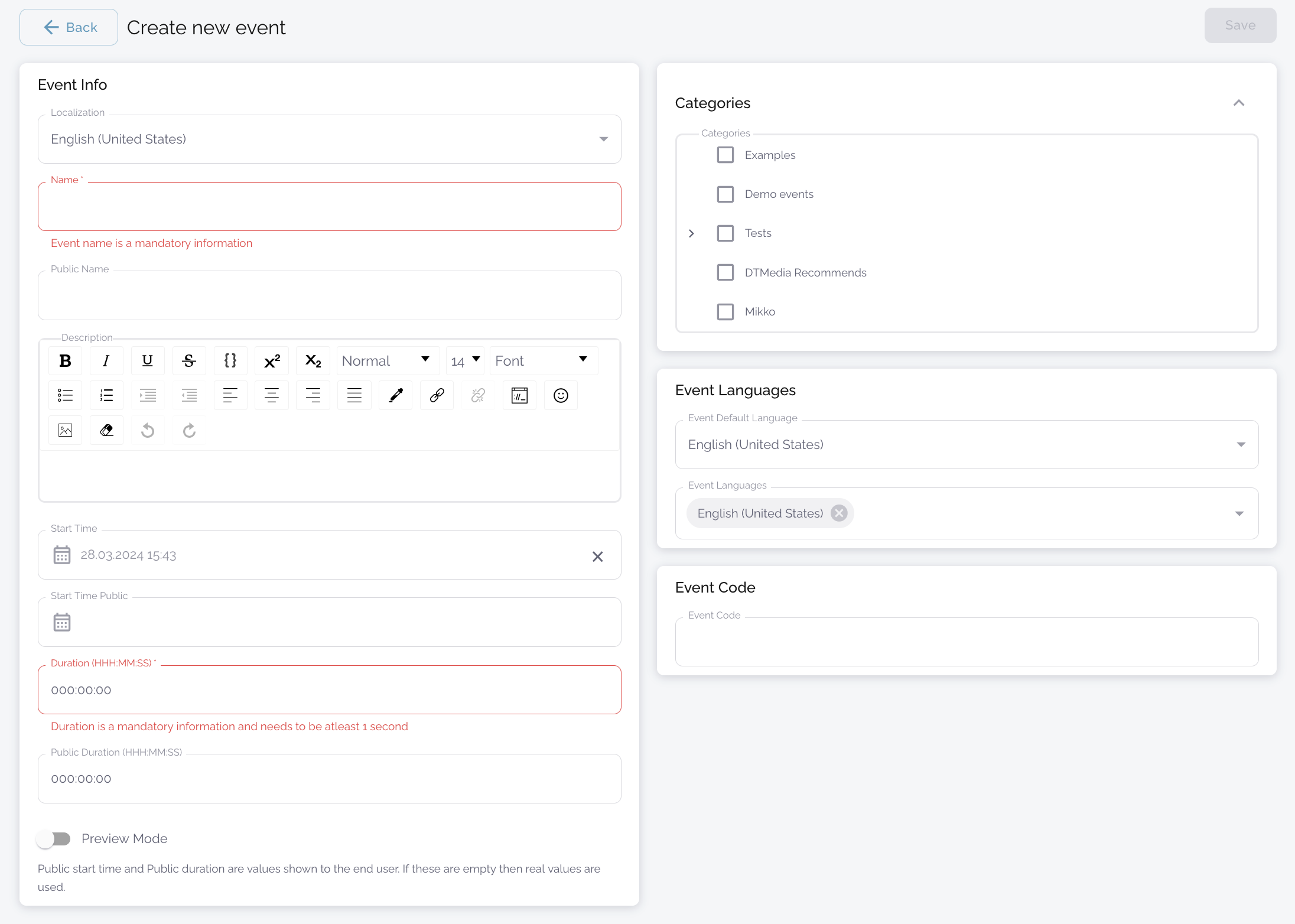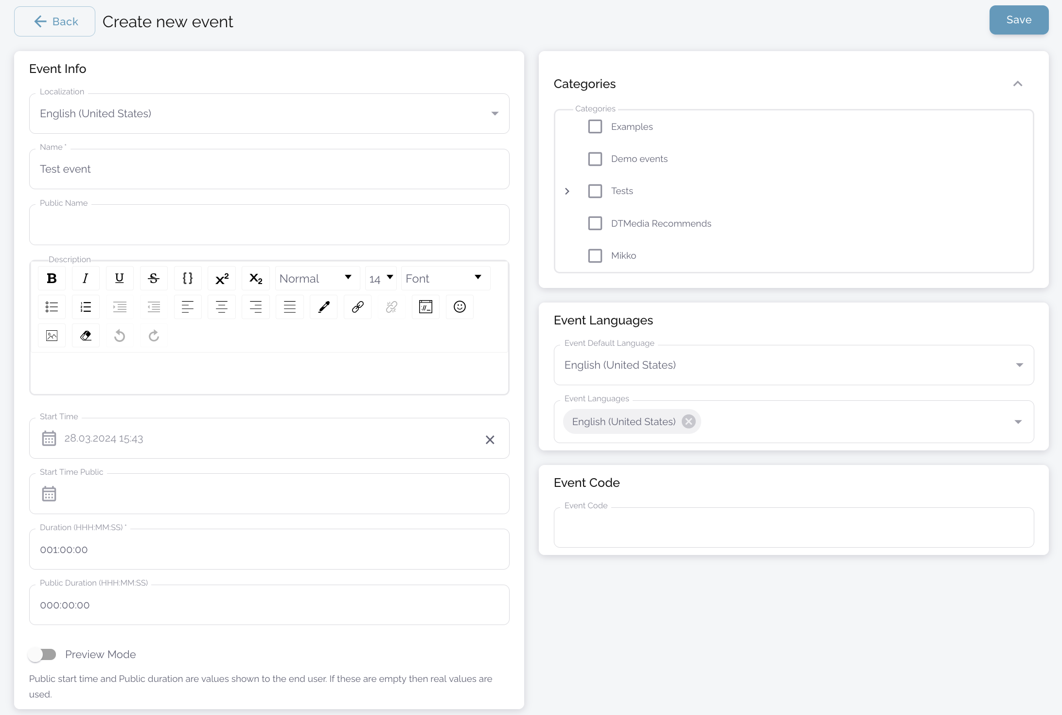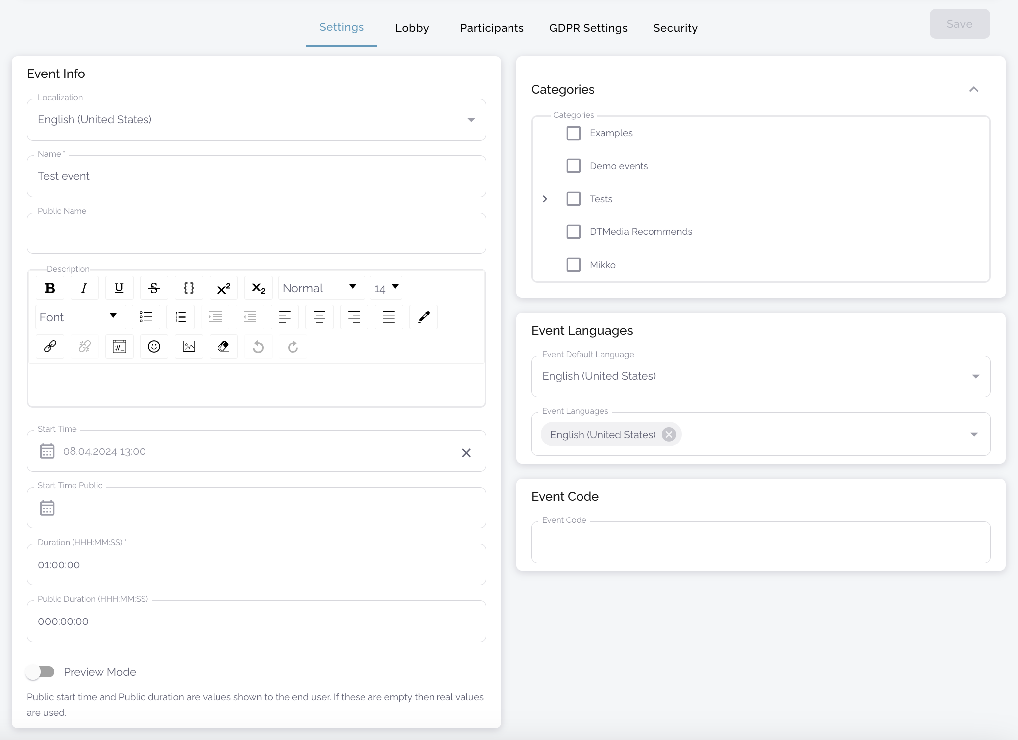 The name, public name and description are saved on a localization-specific basis. By selecting a language from the drop-down menu and then filling in the information in those fields in that language, you can create different versions of your event site for different languages. This allows participants to choose the version they want.