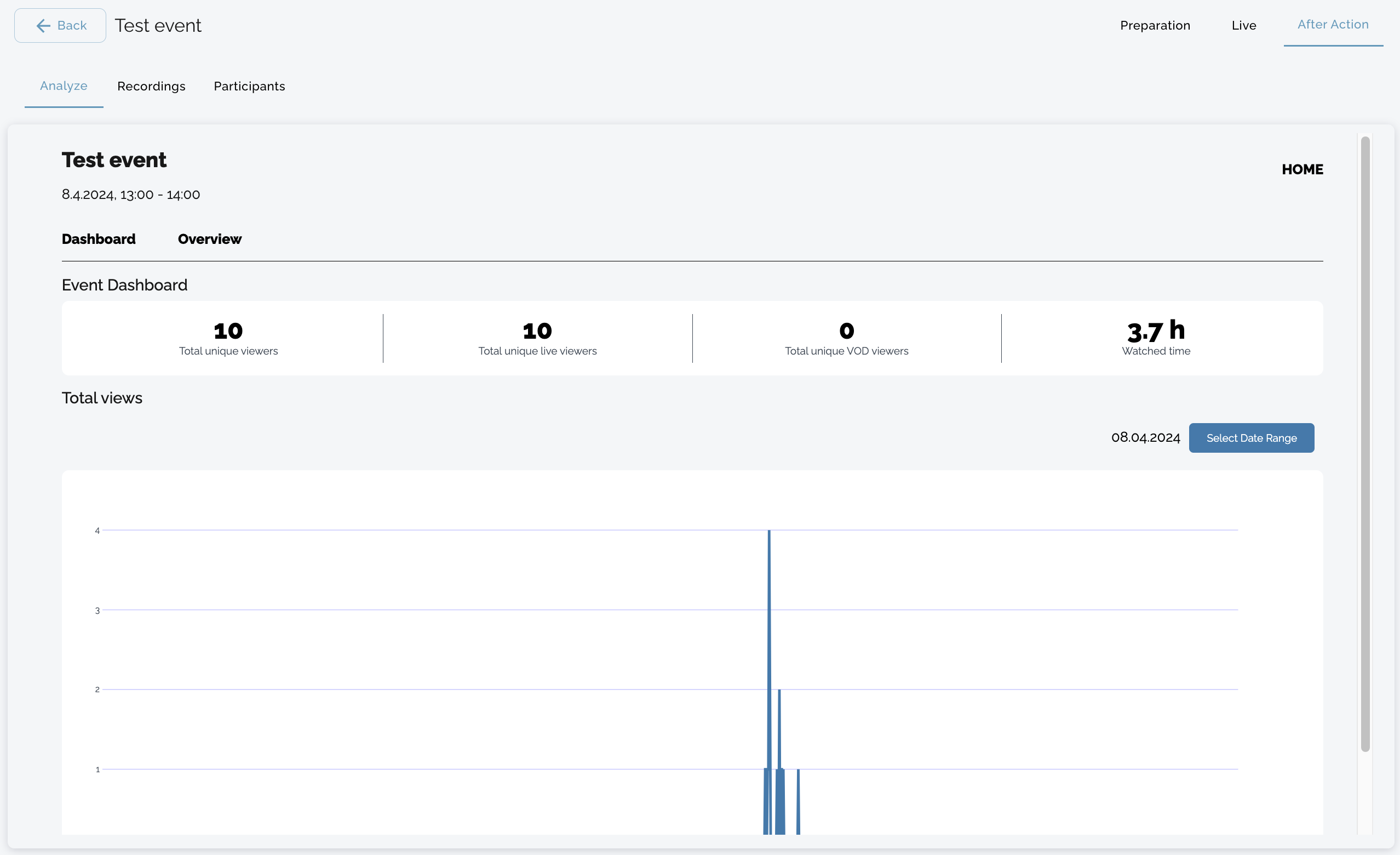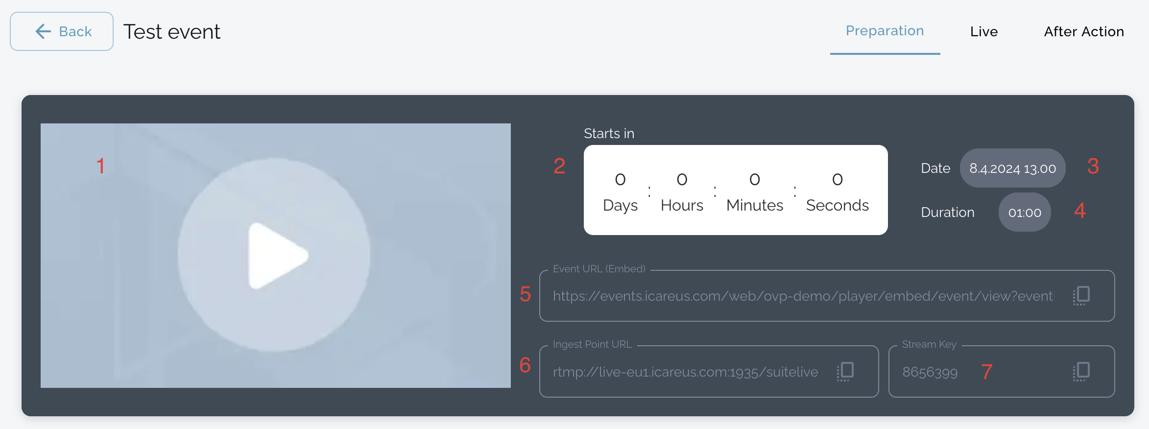 The date and time of the event. The end user can now access the event. The recording of the event starts at this point and continues for the duration of the event. Mandatory field