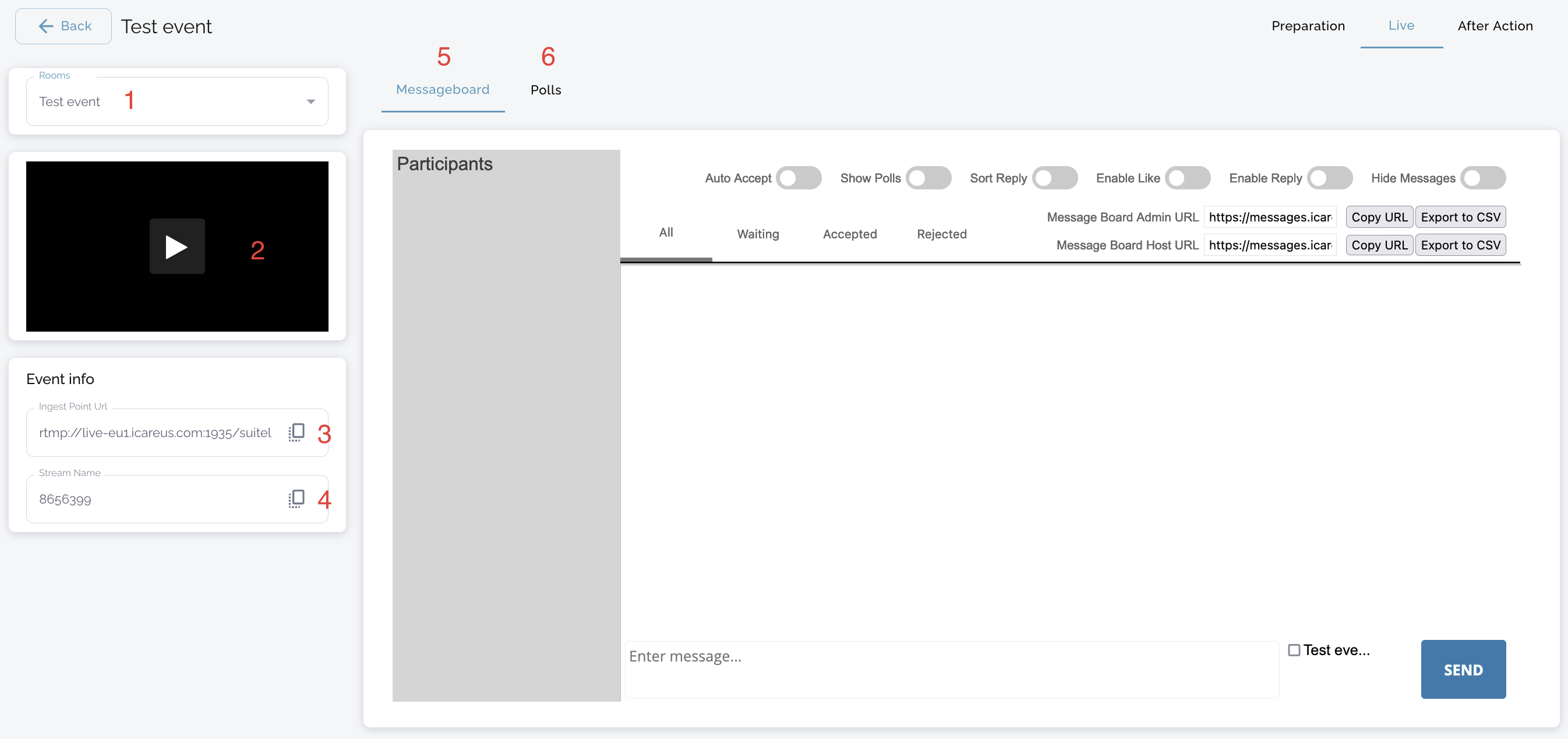 When an event is in Preview mode, the event page can be accessed as if it were in Live mode (even when the event is not live), and all access restrictions are bypassed.