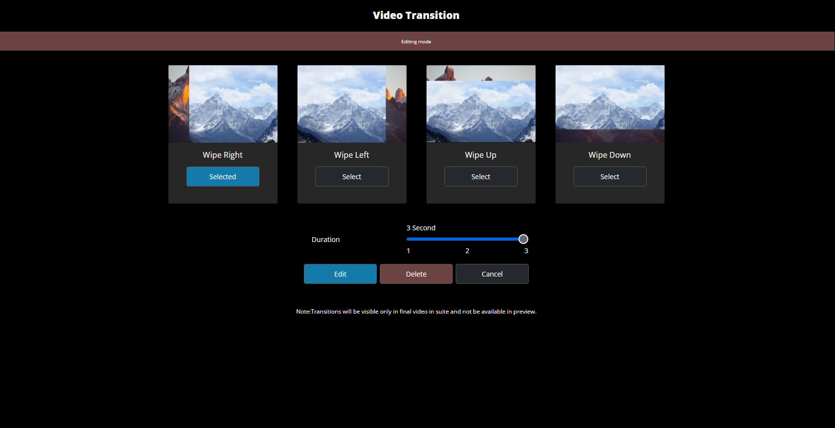 The transition you have currently active is shown as selected. You can change the transition by selecting one of the others. You can also change the duration. Clicking edit will save the choices you've made in the editing mode. You can also delete the transition entirely by clicking the delete button. If you wish to do nothing and undo any edits you may have made, click cancel to leave the menu.