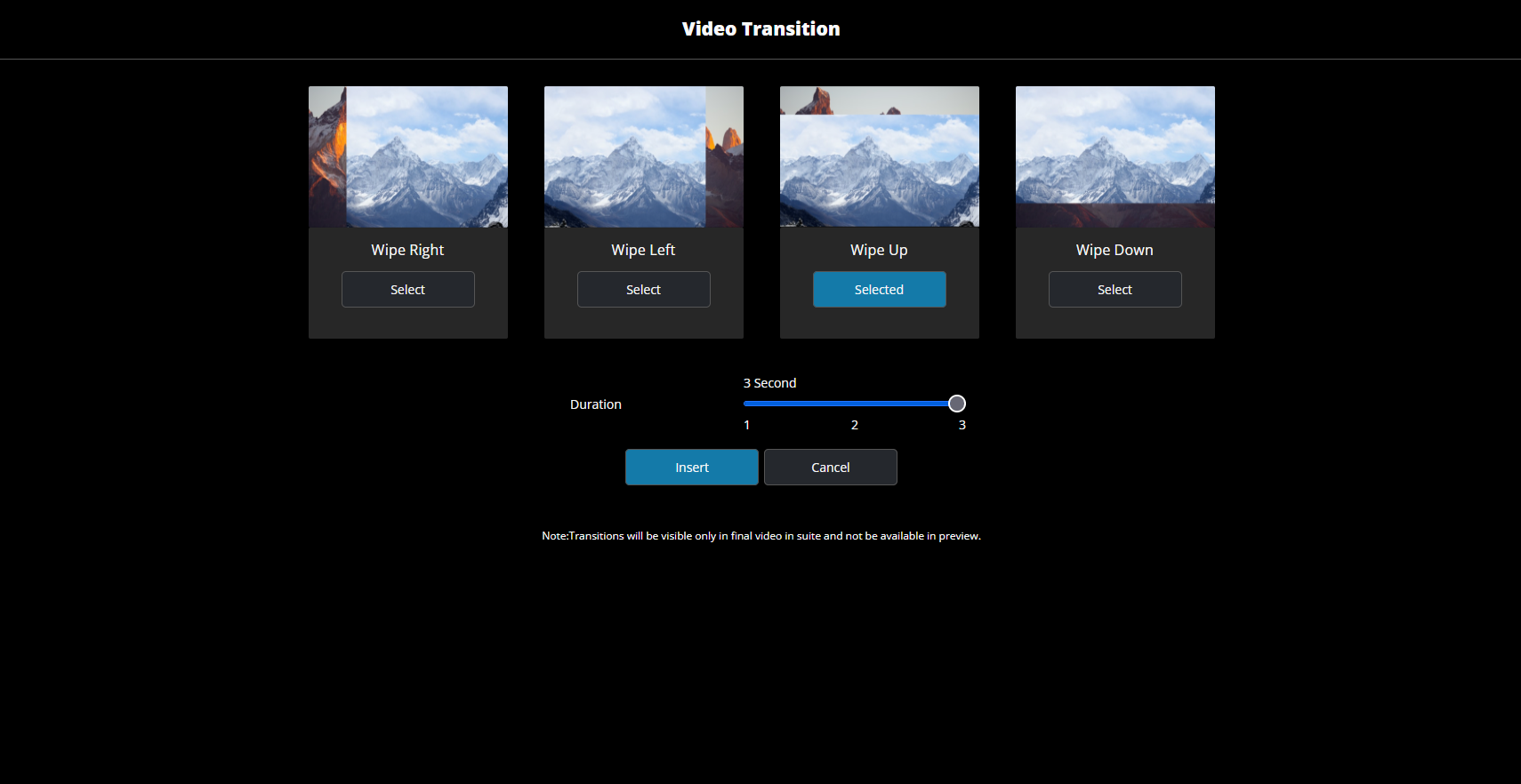 Insert the selected transition by clicking insert. If you haven't selected a transition, this cannot be selected.