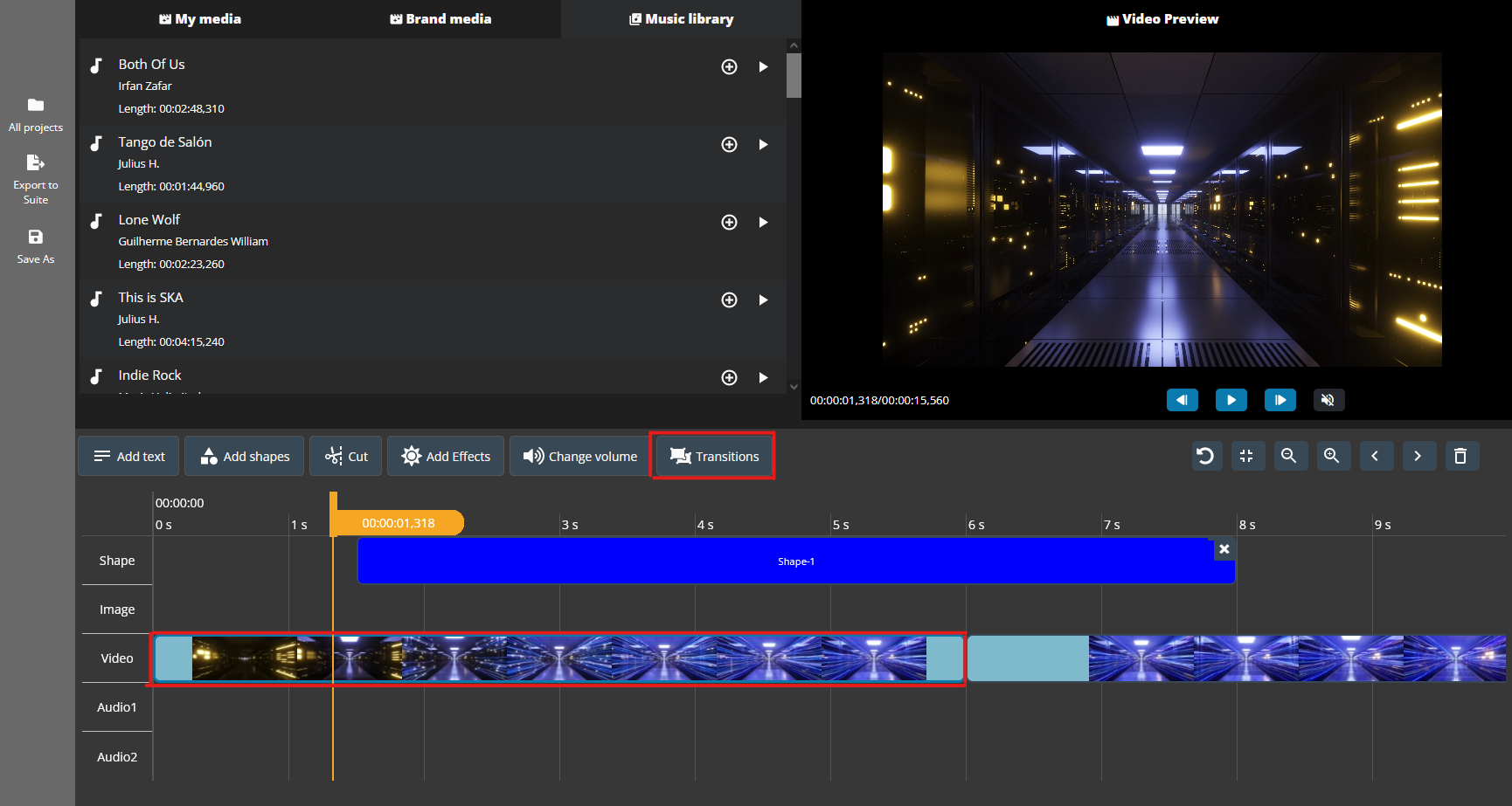 Transitions will be visible only in the final video exported to Suite. It cannot be viewed in the Studio preview.