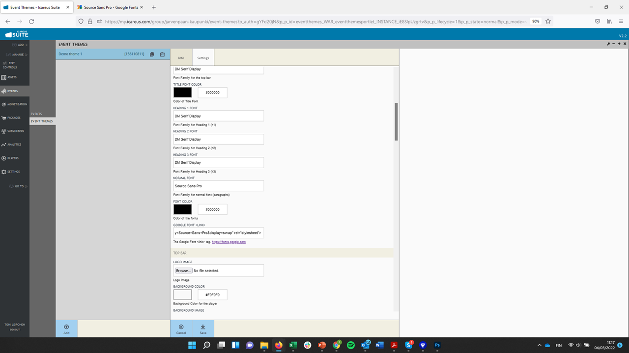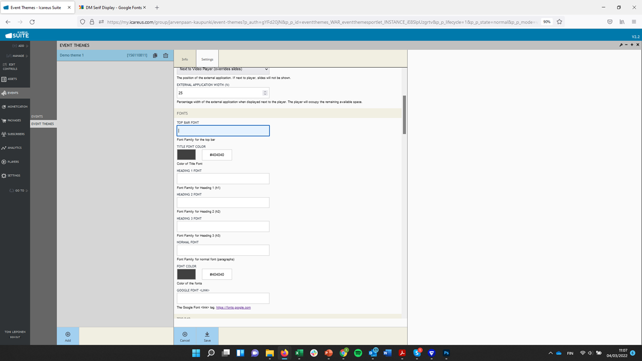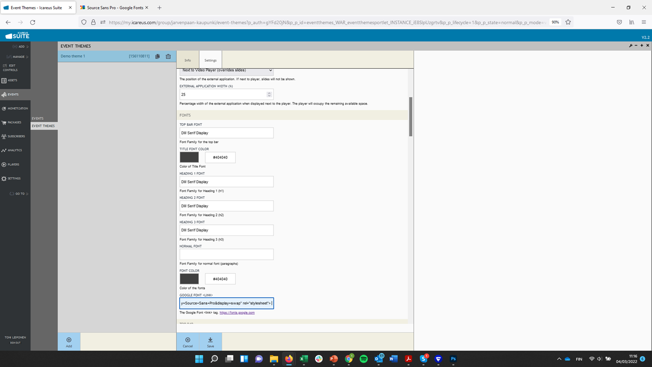 Paste the link on the event theme page to GOOGLE FONT <LINK> box and write the Google Font name to wanted Font configuration box: