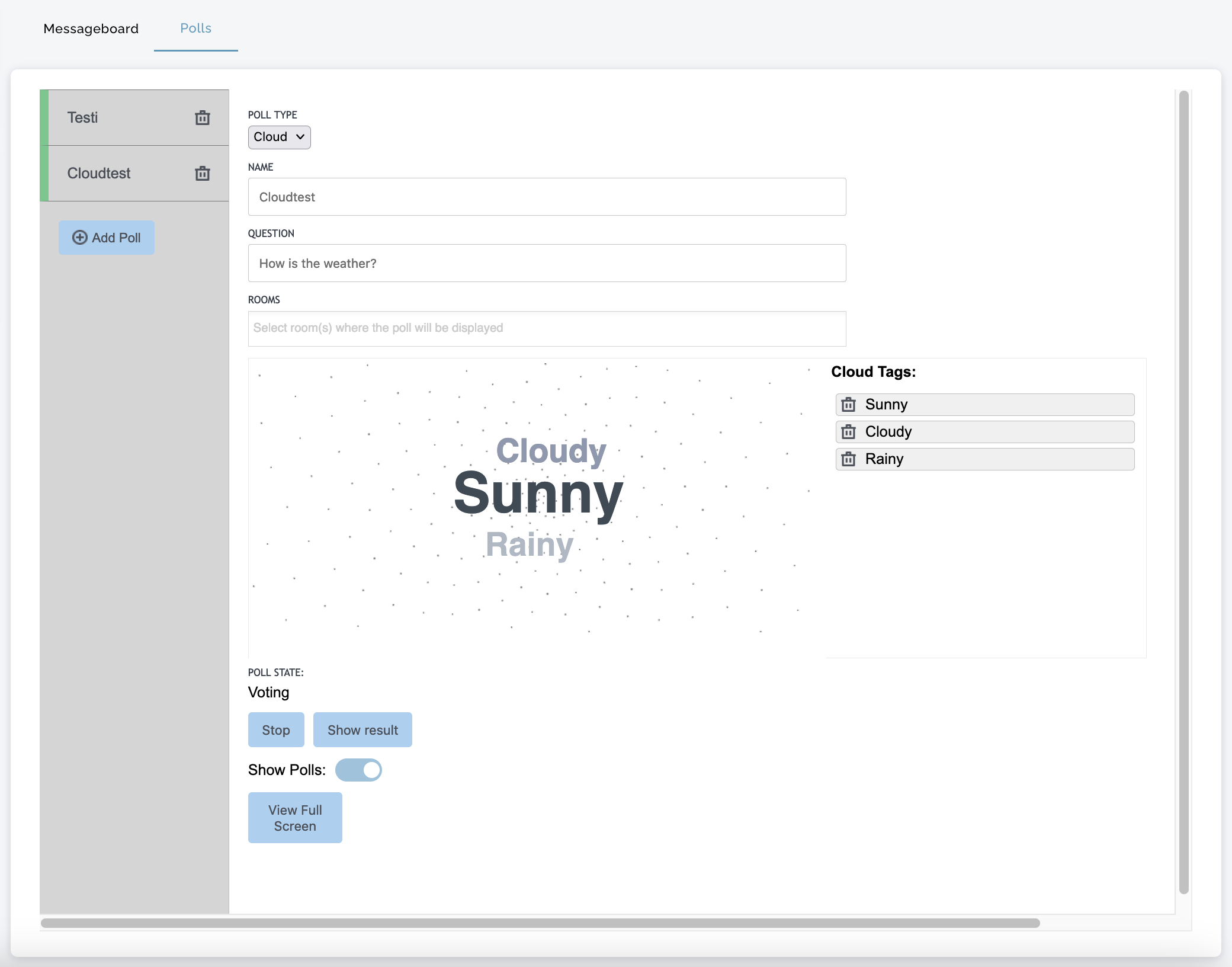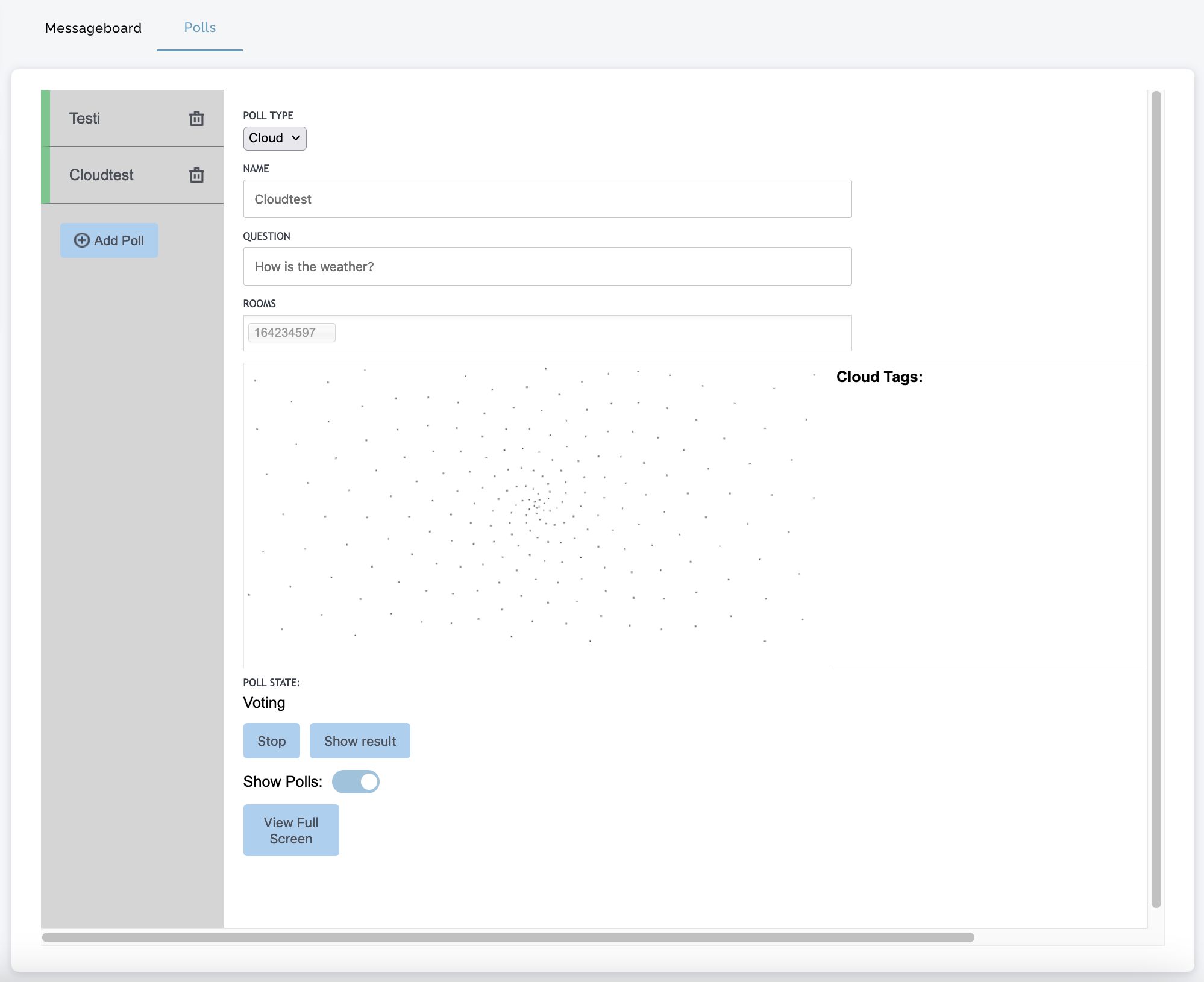 Icareus Word Cloud is a type of Poll and is configured unders Polls management under each event created on Icareus Video Cloud.