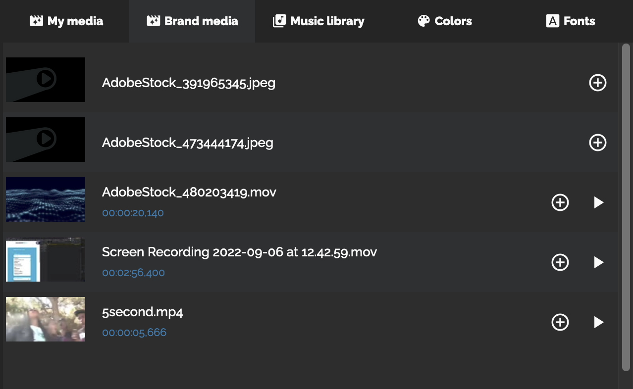 Brändimediatiedostot näkyvät Icareus Studio Editor -työkalun vasemmassa yläkulmassa olevan "Brand media"-välilehden alla: