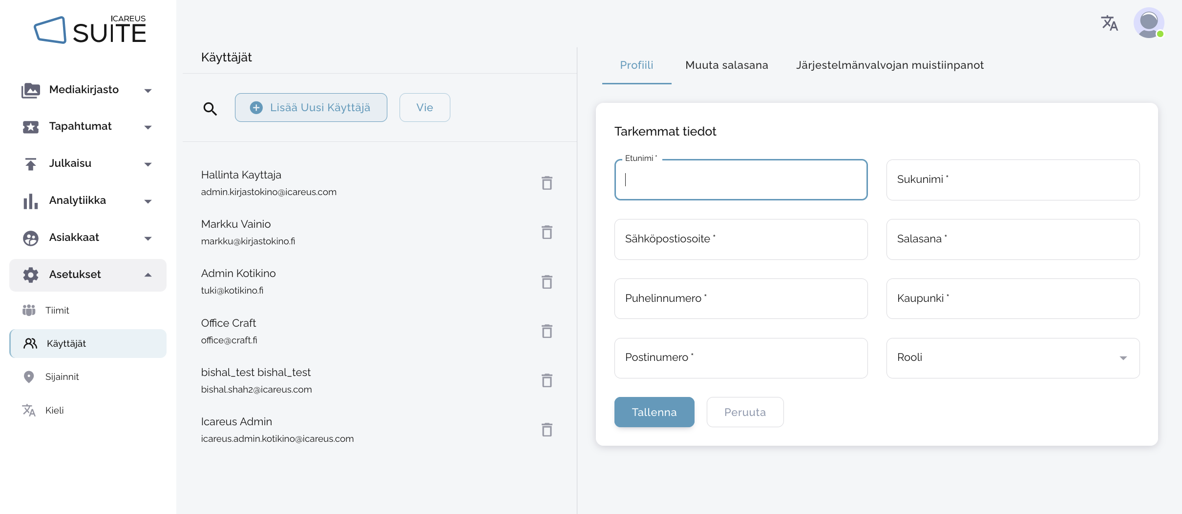 Huomaa, että vain tilin järjestelmänvalvojatason käyttäjät voivat lisätä uusia käyttäjiä.