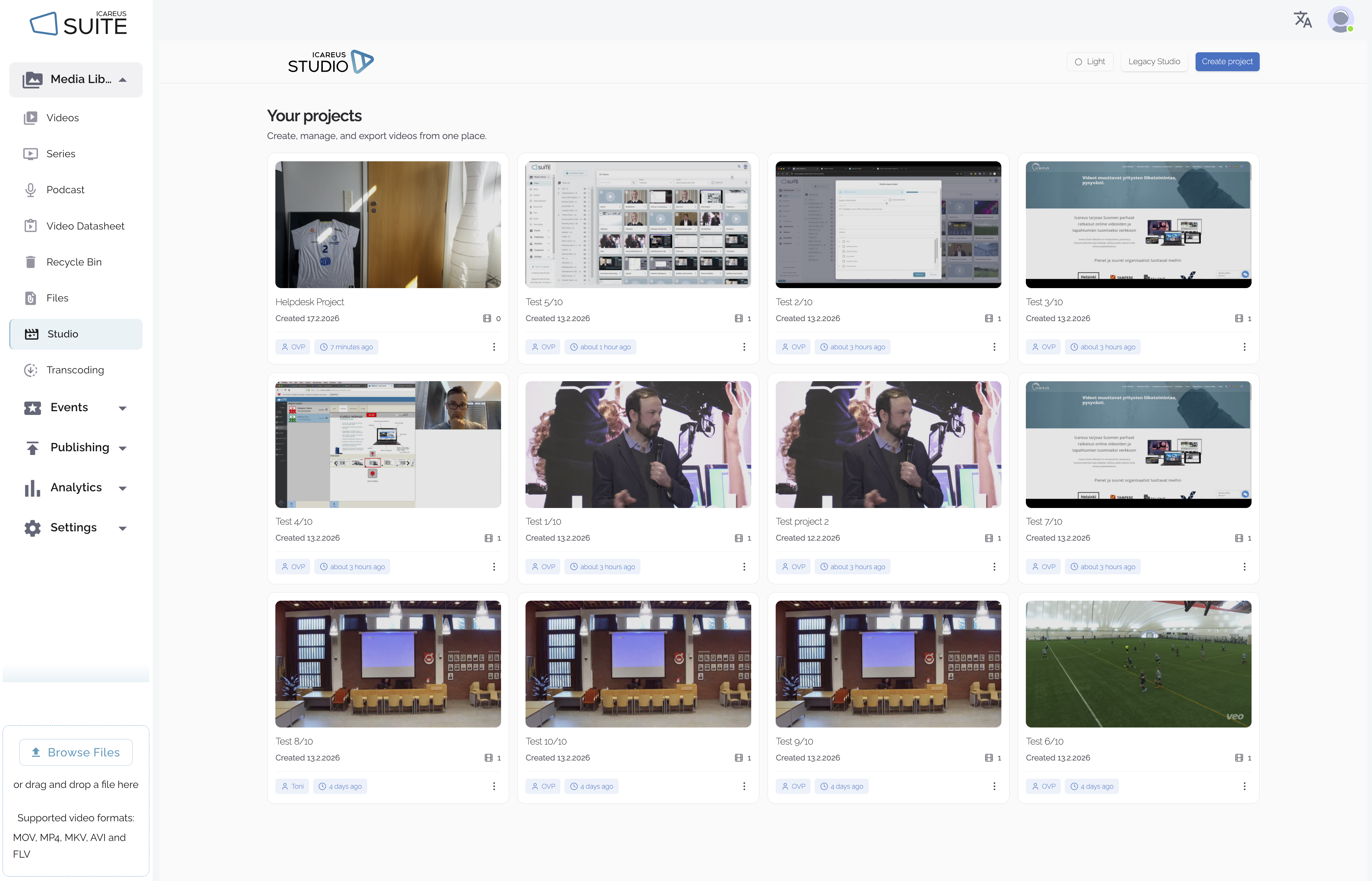 Icareus Studio löytyy päävalikosta nimellä “Studio”. Klikkaamalla sitä avautuu Your projects -sivu.