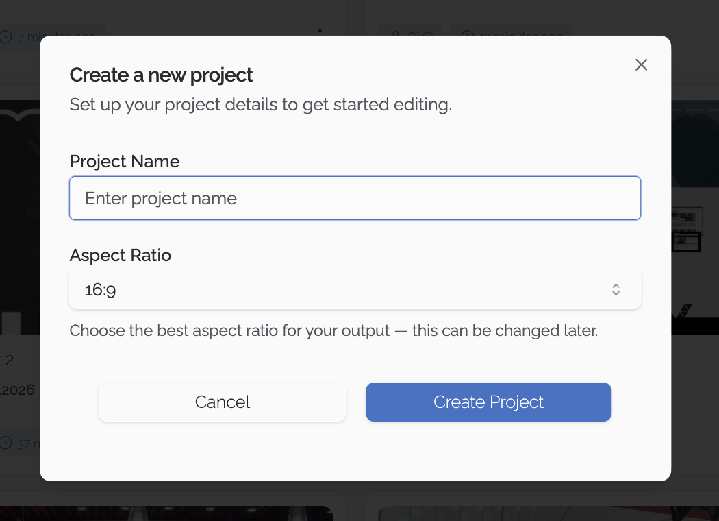 Oletuskuvasuhde on 16:9. Voit muuttaa sen pudotusvalikosta nyt tai myöhemmin projektieditorissa.
