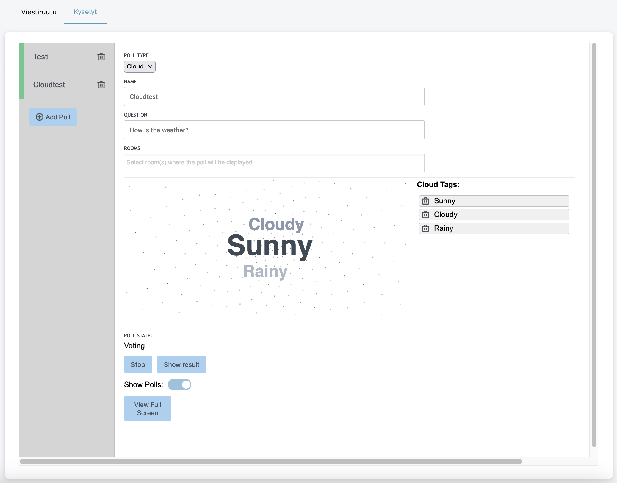 Kun ylläpitäjä/moderaattori napsauttaa "Näytä tulos", osallistuja voi tarkastella Word Cloudia: