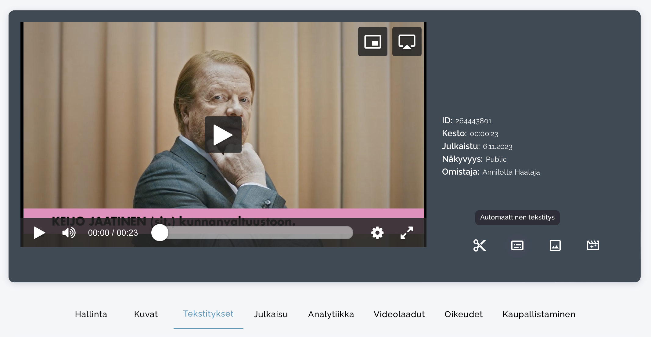 Tekstityksen tuottaminen alkaa videon omalta sivulta. Automaattisen tekstityksen painike on yksi neljästä videosoittimen oikealla puolella, toinen kuvake vasemmalta. Sen yläpuolella lukee "Automaattinen tekstitys" jos pidät hiirtä painikkeen päällä.