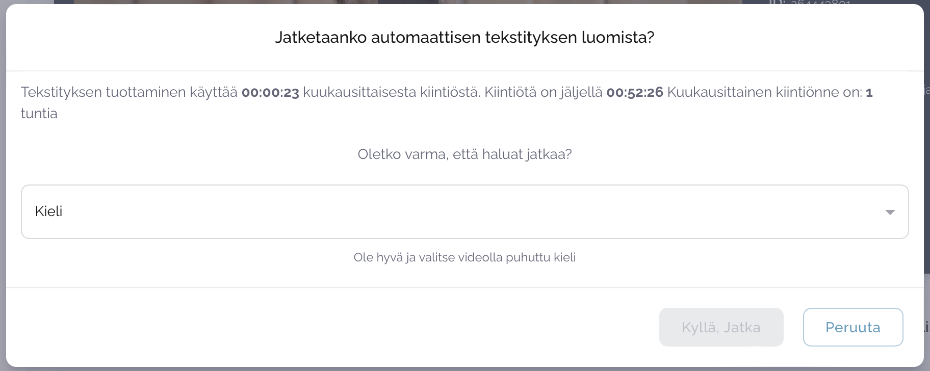 Modaali kysyy, haluatko jatkaa automaattista tekstityksen tuottamista. Jatkaminen kuluttaa kuukausittaista kiintiötäsi tekstitettävän videon pituuden verran.