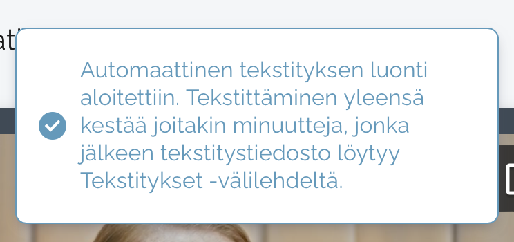 Ilmoituksen teksti: 'Automaattinen tekstityksen luonti aloitettiin. Tekstittäminen yleensä kestää joitakin minuutteja, jonka jälkeen tekstitystiedosto löytyy Tekstitykset-välilehdeltä.'