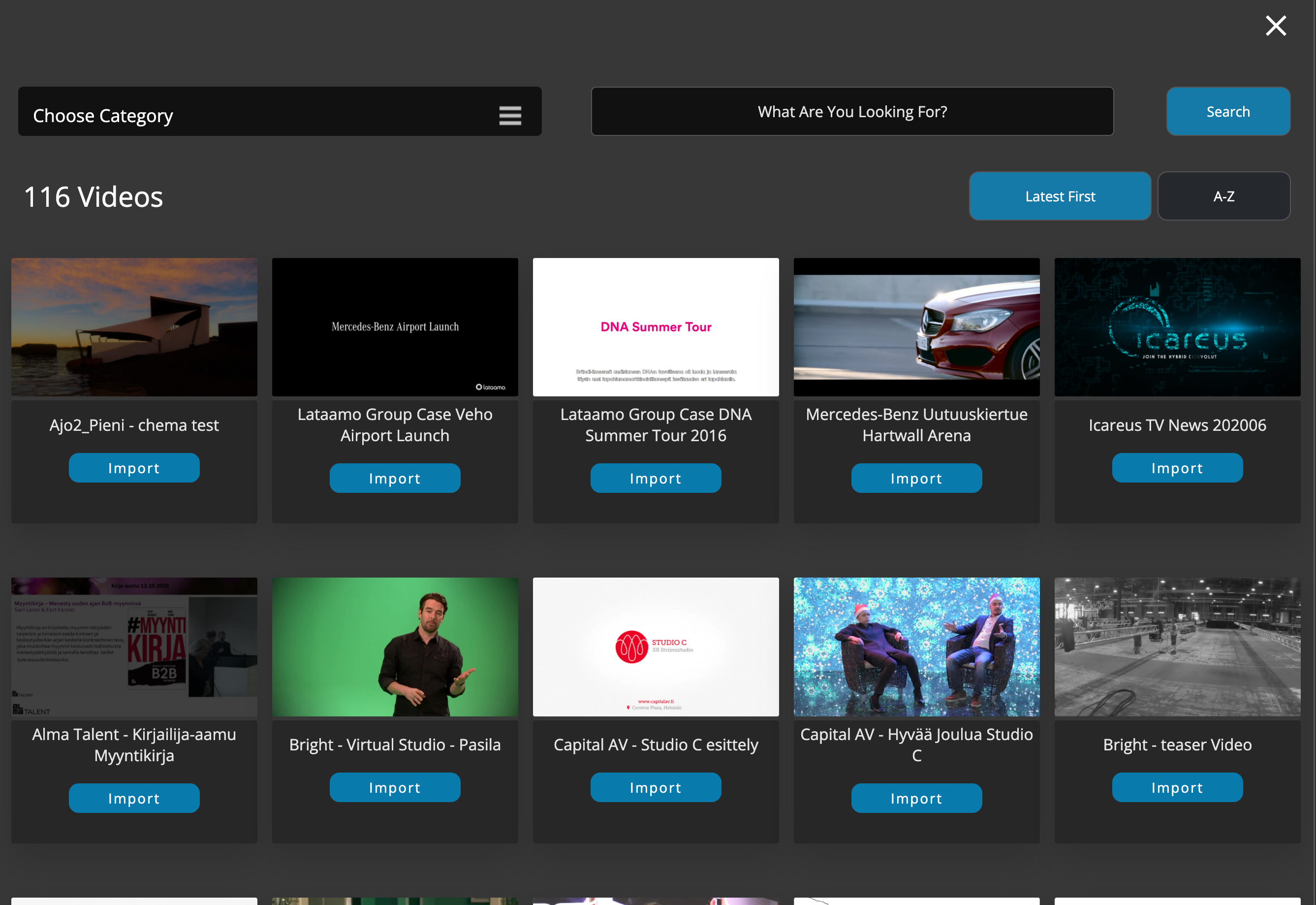 "Import"-painike avaa modaalin, jossa voit valita tuotavan tiedoston joko valitsemalla kategorian tai tekemällä haun.