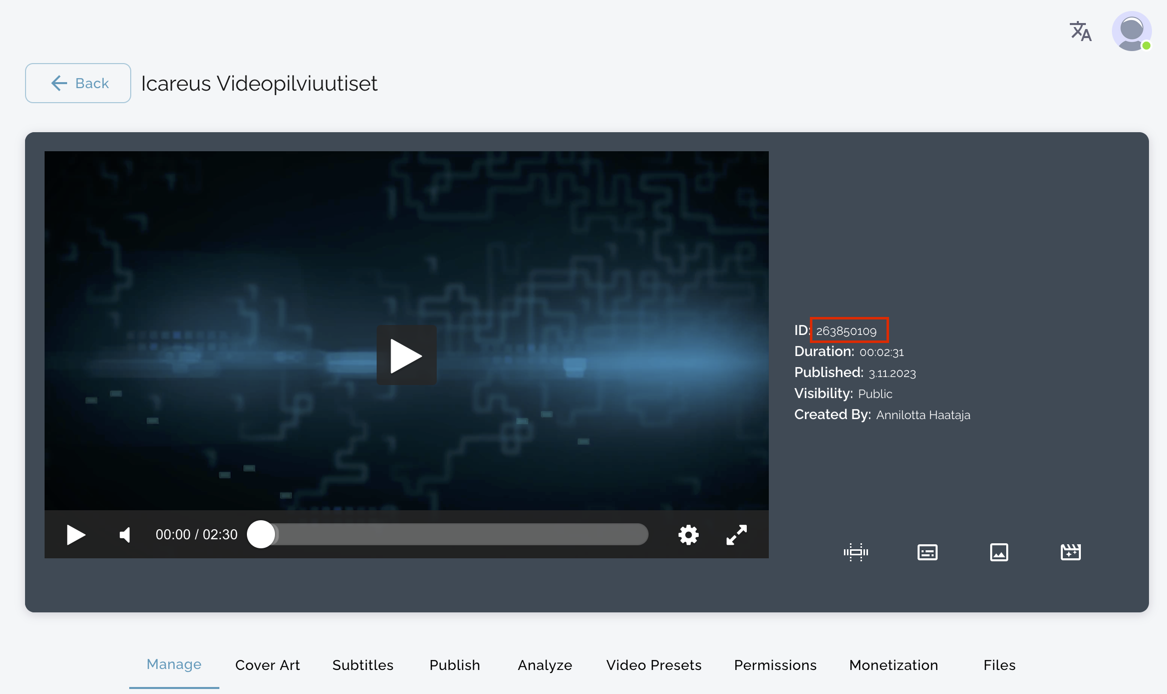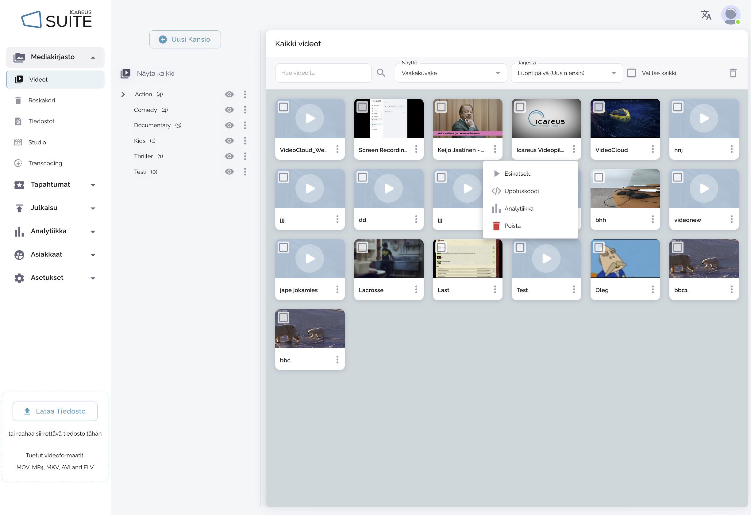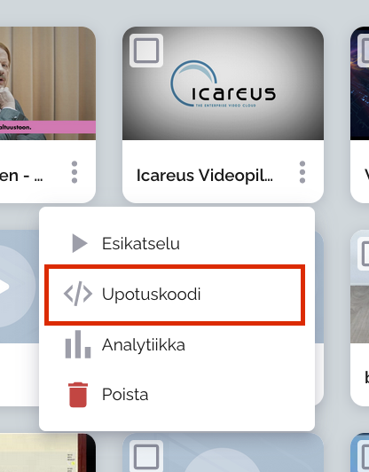 Siirry Icareus Suite -tilillesi -> Videot ja etsi upotettava video. Avaa videon hampurilaisvalikko ja napsauta Upota-vaihtoehtoa.