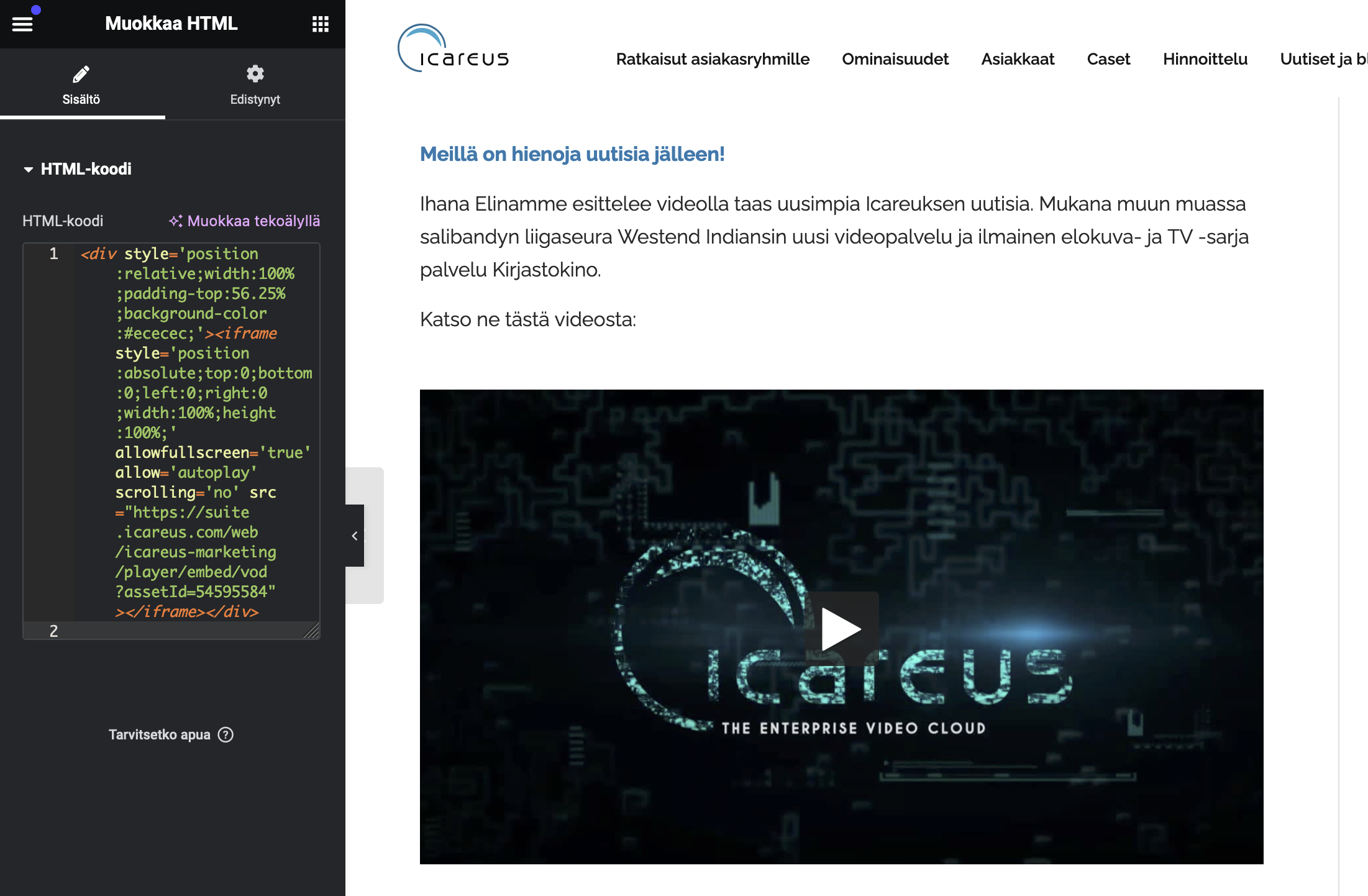 - Videon upottaminen käyttämällä Icareus WP Plugin + lyhytkoodia