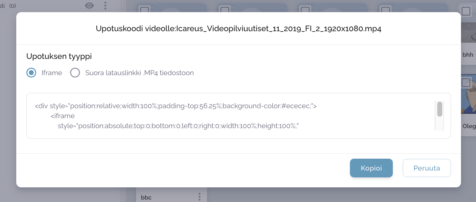Modaali avautuu. Iframe on jo valittu upotustyypiksi oletuksena. Napsauta alareunassa olevaa Kopioi-painiketta kopioidaksesi tekstiruudun sisällön ja sulkeaksesi modaalin.